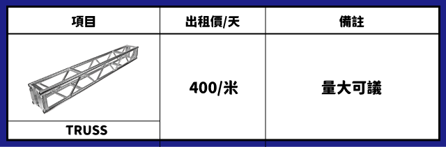TRUSS搭建 價目表如下: