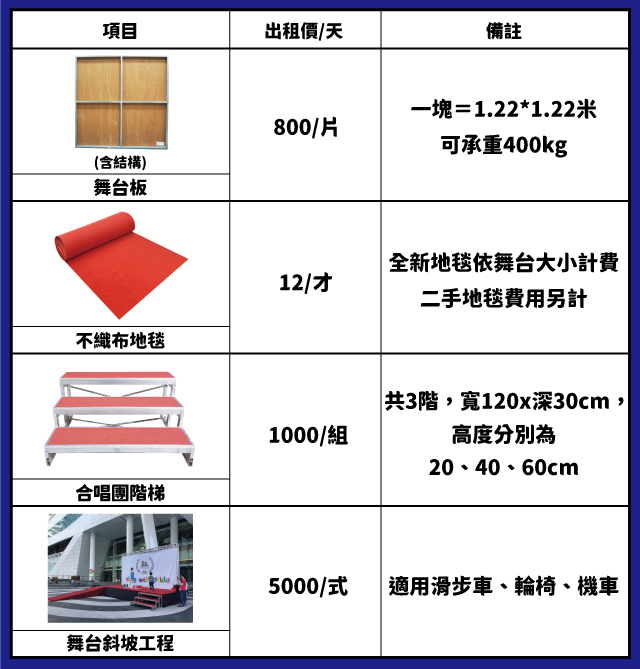 舞台系統:1.22*1.22米 / 800元