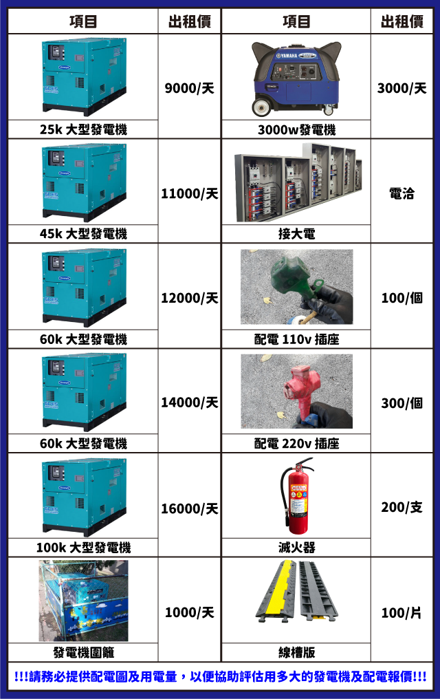 發電機工程 戶外活動的電力需求,需使用到小型、大型發電機 室內電力不足,可能也需要接大電或是租借發電機 發電機出租價目表如下: 分享此文:分享到 Twitter(在新視窗中開啟)按一下以分享至 Facebook(在新視窗中開啟)點擊分享到 Google+(在新視窗中開啟)請按讚:喜歡 載入中... 相關